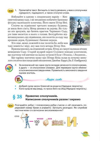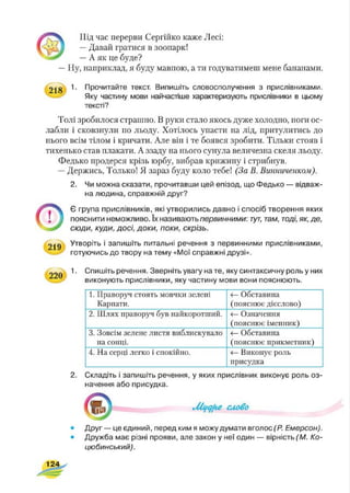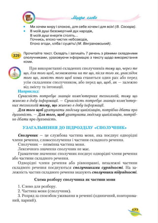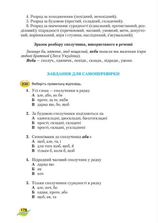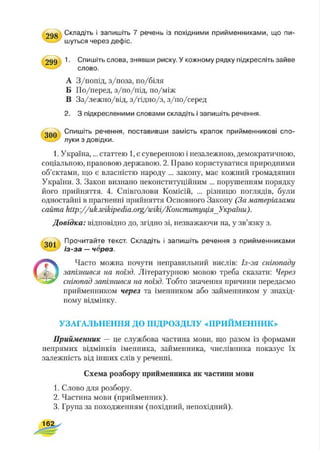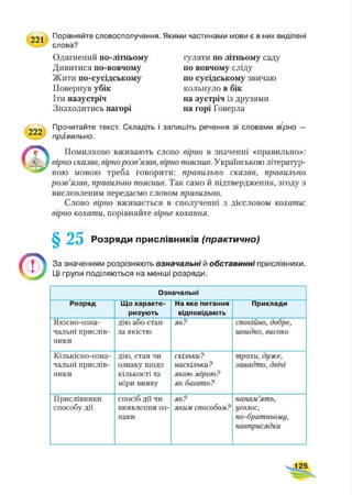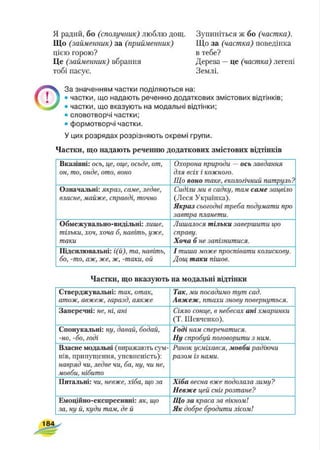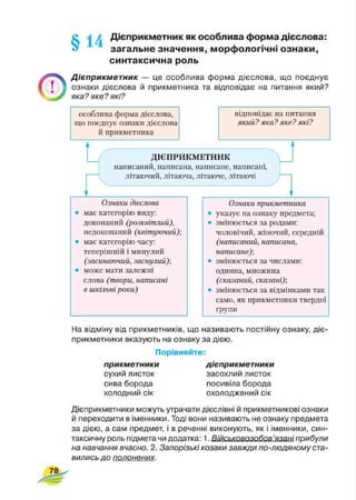ДІЄПРИСЛІВНИК (ФОРМА ДІЄСЛОВА). . . . . . . . . . . . . . . . . . . . . . . . . . . . . . . 103 § 20 Дієприслівник як особлива форма дієслова: загальне значення, морфологічні ознаки, синтаксична роль . . . . . . . . . . . . . . . . . . . . . . . . . . . . . . . 104 § 21 Вид і час дієприслівників. Дієприслівники недоконаного й доконаного виду, їх творення . . . . . . . . . . . . . . . . . . . . . . . . . . . . . . . . . . . . . . . . . . . . . . . 107 § 22 Дієприслівниковий зворот. Коми при дієприслівниковому звороті й одиничному дієприслівникові . . . . . . . . . . . . . . . . . . . . . . . . . . . . . . . . . . . . . . . 111 § 23 Не з дієприслівниками . . . . . . . . . . . . . . . . . . . . . . . . . . . . . . . . . . . . . . . . . . . . . . . . 115 ПРИСЛІВНИК . . . . . . . . . . . . . . . . . . . . . . . . . . . . . . . . . . . . . . . . . . . . . . . . . . . . . . . . . . . . 121 § 24 Прислівник: загальне значення, морфологічні ознаки, синтаксична роль. Наголос у прислівниках . . . . . . . . . . . . . . . . . . . . . . . . . . . . 122 § 25 Розряди прислівників (практично) . . . . . . . . . . . . . . . . . . . . . . . . . . . . . . . . . . . . 125 § 26 Ступені порівняння прислівників. Способи творення прислівників . . . . 129 § 27 Букви н та нн у прислівниках . . . . . . . . . . . . . . . . . . . . . . . . . . . . . . . . . . . . . . . . . 133 § 28 Ні і не з прислівниками . . . . . . . . . . . . . . . . . . . . . . . . . . . . . . . . . . . . . . . . . . . . . . . 135 § 29 І та и в кінці прислівників . . . . . . . . . . . . . . . . . . . . . . . . . . . . . . . . . . . . . . . . . . . . 137 § 30 Правопис прислівників на о, е, утворених від прикметників і дієприкметників . . . . . . . . . . . . . . . . . . . . . . . . . . . . . . . . . . . . . . . . . . . . . . . . . . . . . 139 § 31 Написання прислівників разом і через дефіс . . . . . . . . . . . . . . . . . . . . . . . . . . . 141 § 32 Написання прислівникових словосполучень на зразок: раз у раз, з дня на день... . . . . . . . . . . . . . . . . . . . . . . . . . . . . . . . . . . . . . . . . . . . . 145 ПРИЙМЕННИК . . . . . . . . . . . . . . . . . . . . . . . . . . . . . . . . . . . . . . . . . . . . . . . . . . . . . . . . . . . 151 § 33 Прийменник як службова частина мови. Прийменник як засіб зв’язку слів у словосполученні й реченні . . . . . . . . . . . . . . . . . . . . . . . . . . . . . . 152 § 34 Види прийменників за будовою. Непохідні й похідні прийменники . . . . 155 § 35 Правопис прийменників. Написання похідних прийменників разом, окремо і через дефіс . . . . . . . . . . . . . . . . . . . . . . . . . . . . . . . . . . . . . . . . . . . 160 СПОЛУЧНИК . . . . . . . . . . . . . . . . . . . . . . . . . . . . . . . . . . . . . . . . . . . . . . . . . . . . . . . . . . . . 165 § 36 Сполучник як службова частина мови. Види сполучників за будовою, походженням, способом використання в реченні . . . . . . . . . . . . . . . . . . . . . . . 166 § 37 Використання сполучників у простому й складному реченнях: сполучники сурядності й підрядності. Сполучники й сполучні слова . . . 169 § 38 Правопис сполучників. Написання сполучників разом і окремо . . . . . . . 173 ЧАСТКА . . . . . . . . . . . . . . . . . . . . . . . . . . . . . . . . . . . . . . . . . . . . . . . . . . . . . . . . . . . . . . . . . . . 181 § 39 Частка як службова частина мови. Розряди часток за значенням . . . . . . . 182 § 40 Правопис часток (із займенниками й прислівниками) (повторення). Написання часток бо, но, то, от, таки . . . . . . . . . . . . . . . . . . . . . . . . . . 188 § 41 Не, ні з різними частинами мови . . . . . . . . . . . . . . . . . . . . . . . . . . . . . . . . . . . . . . 190 286