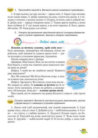 Прочитайте текст. Випишіть10 дієслів (на вибір). Поставте до них пи тання й за ними визначте форму дієслова. Якось надвечір, коли мама поралася на кухні, до неї підійшов син з аркушем паперу. З надто офіційним виглядом хлопець подав аркуш мамі. Ви терши руки, вона почала читати: «Рахунок за мою працю: замітання подвір’я — 5 грн; порядок у кім наті — 10 грн; догляд за сестричкою —15 грн; за дві найвищі оцінки в школі — 10 грн; за те, що виношу сміття щовечора, — 7 грн. Разом — 47 грн». Мама закінчила читати, поглянула на сина й за мислилася. Вона взяла ручку і на зворотному боці аркуша написала: «За те, що носила тебе у своєму лоні 9 місяців, — 0 грн; за всі ночі, які провела коло твого ліжечка, коли ти хворів, — 0 грн; за всі сльози, що витирала з твоїх очей, — 0 грн; за всі сніданки, обіди, підвечірки й вечері та канапки до школи — 0 грн; за життя, присвячене тобі щодня, — 0 грн. Разом — 0 грн». Після цього мама, лагідно усміхаючись, подала аркуш синові. Хлопець прочитав написане й почервонів. Він перегорнув аркуш і на своєму ра хунку написав: «Сплачено». Потім обійняв маму і, ховаючи обличчя, притулився до неї. Коли в особистих і родинних стосунках починаються розрахунки, усе закінчується недобре. Любов не припускає розрахунку, інакше її просто немає (За Б. Ферреро). Хоч з лиця води напийся — дуже гарний/гарна, вродливий/врод лива. Яся. Чому, бабусю, коли про когось кажуть «гарна» чи «гарний», то іноді додають «хоч з лиця воду пий»? Водою, зрозуміло, умиваються, але хіба можна з лиця воду пити? Бабуся. Звичайно п’ють воду з чистого джерела, криниці. Чиста, про зора вода уособлює красу, вроду. У чистій, спокійній воді, як у дзеркалі, відбивається образ людини. Тільки про гарних, вродливих кажуть, що з їхнього лиця можна воду пити. Дмитрик. Є ще й таке прислів’я: «Подивись у воду на свою вроду». Бабуся. У давніх віруваннях українців вода займала особливе місце: з чистою водою завжди пов’язували і красу, і здоров’я. Тому здорову, сильну людину характеризують так: «Дужий, як вода». 28 43