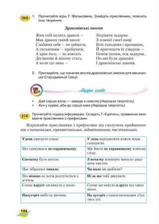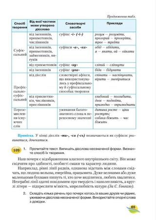 дзвонячи в тишімолодим сміхом. Втомившись, вони забирались на біле каміння і лячно зазирали звідти в прірву... (За М. Коцюбинським). 2. Простежте, як бавляться на ігровому майданчику малі діти. Скла діть 3–4 речення за результатами своїх спостережень. Випишіть із художніх текстів, уміщених у підручнику з української лі тератури, по 5 дієслів доконаного й недоконаного виду. Обґрунтуйте належність дієслів до різних видів. Дієслова доконаного та недоконаного виду часто (але не обов’яз ково) утворюють видові пари, які відрізняються лише значенням виду: читати — прочитати, смикати — смикнути, зігріти — зігрівати. Дієслова доконаного виду утворюються від недоконаного за допомогою  префіксів з (с ), за , на , по , при , про , ви робити — зробити копали — скопали шила — зашила лити — налити зеленіти — позеленіти в’яжуть — прив’яжуть стеживши — простеживши тканий — витканий текти — витекти  випадання голосних звуків забирати — забрати у коренях слів присилати — прислати Дієслова недоконаного виду утворюються від доконаного за допомогою  суфіксів а , ува , ва лягти — лягати виписати — виписувати зігріти — зігрівати  зміни наголосу вèкидати — викидàти розр³зати — розрізàти склèкати — скликàти 1. Прочитайте вірш Г. Фальковича. Поміркуйте, чому цей вірш сприй мається як загадка. Які засоби поет використав, щоб досягнути несподіваного закінчення вірша? 39    66 67