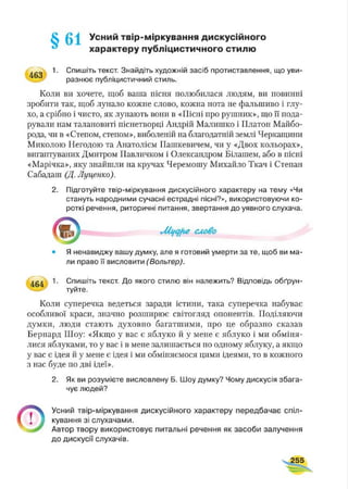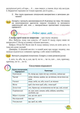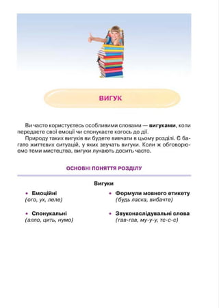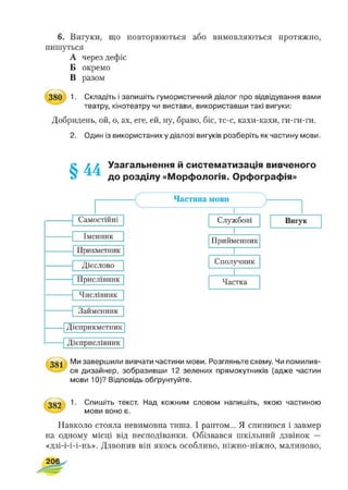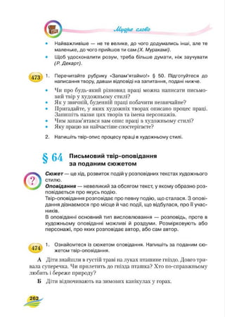 ВИГУК . .. . . . . . . . . . . . . . . . . . . . . . . . . . . . . . . . . . . . . . . . . . . . . . . . . . . . . . . . . . . . . . . . . . 195 § 42 Вигук як особлива частина мови. Групи вигуків за значенням . . . . . . . . . . 196 § 43 Правопис вигуків. Дефіс у вигуках. Кома і знак оклику при вигуках . . . . . . . . . . . . . . . . . . . . . . . . . . . . . . . . . . . . . . . 200 § 44 Узагальнення й систематизація вивченого до розділу «Морфологія. Орфографія» . . . . . . . . . . . . . . . . . . . . . . . . . . . . . . . . . . . . . . . . . . 206 ЗВ’ЯЗНА МОВА (МОВЛЕННЯ) . . . . . . . . . . . . . . . . . . . . . . . . . . . . . . . . . . . . . . . . . 213 § 45 Повторення вивченого про текст . . . . . . . . . . . . . . . . . . . . . . . . . . . . . . . . . . . . . 214 § 46 Повторення вивченого про мовні стилі. Публіцистичний стиль . . . . . . . . 216 § 47 Складний план власного висловлювання . . . . . . . . . . . . . . . . . . . . . . . . . . . . . . 220 § 48 Різновиди читання: ознайомлювальне, навчальне . . . . . . . . . . . . . . . . . . . . . 223 § 49 Повторення вивченого про типи і жанри мовлення. Опис зовнішності людини. Стилістична помилка . . . . . . . . . . . . . . . . . . . . . . 225 § 50 Особливості побудови опису дій. Опис процесу праці . . . . . . . . . . . . . . . . . 230 § 51 Особливості побудови тексту міркування дискусійного характеру . . . . . 232 § 52 Перекази за простим і складним планом. Усний докладний переказ з елементами опису зовнішності людини . . . . . . . . . . . . . . . . . . . . . . . . . . . . . . 234 § 53 Усний докладний переказ тексту публіцистичного стилю . . . . . . . . . . . . . . 236 § 54 Усний переказ тексту наукового стилю . . . . . . . . . . . . . . . . . . . . . . . . . . . . . . . . 238 § 55 Письмовий докладний переказ з елементами опису зовнішності людини в художньому стилі . . . . . . . . . . . . . . . . . . . . . . . . . . . . . . 240 § 56 Письмовий докладний переказ тексту міркування дискусійного характеру . . . . . . . . . . . . . . . . . . . . . . . . . . . . . . . . . . . . . . . . . . . . . . 242 § 57 Письмовий переказ з елементами опису дій (художній стиль) . . . . . . . . . . 245 § 58 Дискусійний діалог . . . . . . . . . . . . . . . . . . . . . . . . . . . . . . . . . . . . . . . . . . . . . . . . . . 247 § 59 Усний твір опис зовнішності людини . . . . . . . . . . . . . . . . . . . . . . . . . . . . . . . . . 250 § 60 Твір опис дій на основі власних спостережень (усний і письмовий) . . . . . 252 § 61 Усний твір міркування дискусійного характеру публіцистичного стилю . . . . . . . . . . . . . . . . . . . . . . . . . . . . . . . . . . . . . . . . . . . . . . . . 255 § 62 Письмовий твір опис зовнішності людини за картиною в художньому стилі . . . . . . . . . . . . . . . . . . . . . . . . . . . . . . . . . . . . . . 258 § 63 Письмовий твір опис дій . . . . . . . . . . . . . . . . . . . . . . . . . . . . . . . . . . . . . . . . . . . . . 260 § 64 Письмовий твір оповідання за поданим сюжетом . . . . . . . . . . . . . . . . . . . . . . 262 § 65 Портретний нарис у публіцистичному стилі . . . . . . . . . . . . . . . . . . . . . . . . . . . 264 § 66 Анотація . . . . . . . . . . . . . . . . . . . . . . . . . . . . . . . . . . . . . . . . . . . . . . . . . . . . . . . . . . . . . 266 § 67 Ділові папери. Розписка . . . . . . . . . . . . . . . . . . . . . . . . . . . . . . . . . . . . . . . . . . . . . . 269 Додатки . . . . . . . . . . . . . . . . . . . . . . . . . . . . . . . . . . . . . . . . . . . . . . . . . . . . . . . . . . . . . . 271