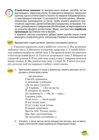 1. Прочитайте текст.З’ясуйте лексичне значення слова сповиток. По..тичне слово відгукується в музичних творах, у картинах художн..ків. Воно — невичерпне джерело натхнення для митців. Їхнє відчут..я Кобзаревих об разів п..редають кольори картини або звуки музики. Перед нами портрет дівчини. Тонкі риси видов женого обличчя, великі темні очі, виразні, шнуроч ком брови, чітко окреслені губи, рівний ніс. Світла стрічка відтінює темне волос..я. Прямий проділ ді лит.. волос..я на два пасма. Вони частково закрива ють ш..рокий лоб і п..р..ходять у товсту довгу косу, яку дівчина перекинула через пл..че. Коса ніби о..плі тає з одного боку тонку довгу шию. Ніжну задуму об лич..я пі..креслюють дві руки, що торкаються стовбура гінкого дерева. Руки витонч..ні, з довгими пальцями, ніби сама пр..рода створила їх для гри на музичному інструменті. Очі дівчини наче пр..мовляють до когось Шевченковим «Нащо мені ч..рні брови, нащо карі очі», а до ко гось — рядками Івана Драча: Я — дівчина, я — скрипка тонкостанна. Я — ніжна ніч у зорянім вінку. У мене тіло з білого туману, Із сонця у хмариннім сповитку. С. Єрмоленко 2. Випишіть речення з дієсловами, вставляючи пропущені букви. Визначте особову форму дієслів. Підкресліть дієслова неозначеної форми. 3. Виберіть із віршованих рядків словосполучення з епітетами. За пишіть їх у називному відмінку. Складіть опис зовнішності свого друга чи подруги, використовуючи неозначену форму та особові форми дієслова, а також словосполу чення з епітетами та вислови на зразок очі сяють, волосся в’ється. Прочитайте текст. Складіть речення зі словами відмінèти, скасувàти. Слова відмінити, скасувати, незважаючи на спільне зна чення «визнавати, робити що небудь недійсним», — різні за своєю сполучуваністю. 35 58 Н. Лопухова. Літографія. 1964 р. 59 60