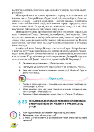 4. Об’єднайтеся вчотири групи. Кожна група складає за одним із малюнків геніального данського карикатуриста Х. Бідструпа роз повідь про поведінку людей відповідного типу темпераменту. Ви користайте всі форми дієслова (неозначена форма, особові фор ми, дієприкметник, дієприслівник, безособові форми на но, то). 1. Прочитайте текст. До якого стилю він належить? Офіційно діловий стиль — це стиль ділових документів. Йому властиві мовні кліше, наприклад такі: згідно з розпорядженням, відповід но до чинного законодавства, порядок денний, поставити питання на розгляд, довести до відома, узяти до уваги, ужити заходів. У медичній галузі, наприклад, побутують кліше на зразок госпіта лізація хворого, дослідження крові, відчуття болю, затьмарення свідо мості, забите місце, згідно з приписом лікаря, лікарняний листок тощо. Однією з морфологічних ознак офіційно ділової мови є вживання дієслів у формі теперішнього й минулого часу зі значенням постійної дії (пропонується, надсилається, слухали, ухвалили), безособових діє слів (перевірено, рекомендовано), інфінітива (призначити, звільнити). 2. Складіть і запишіть речення з виділеними дієсловами. 1. Спишіть вірш Є. Плужника. Падає з дерев пожовкле листя, День уже в обіди догорів, — Кажуть, що вночі на передмістя Осінь приблукала з хуторів. В центрі вона буде завтра ранком, Повагом вступаючи туди... Що ж! Приходь, задумлива селянко, — Я тебе побачити радий. 32 50 51