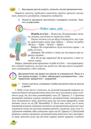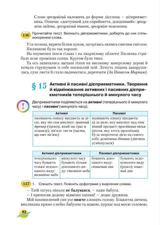 Дмитрик. Насправді цедобре помітно, бо ж то не справжня здорова кров грає, а фарби. Бабуся. Так, це не здорові рум’янці, не ті, що від здо рової їжі. Молоко колись було такою їжею. Коли п’ють справжнє молоко, шкіра робиться гладенькою, ніжною й рожевою — як кров з молоком. Творення дієслів минулого часу Дієслова минулого часу утворюються від основи інфінітива (без суфікса ти, ть) за допомогою суфікса в у чоловічому роді та суфікса л у жіночому і середньому роді та в множині: співати — співав, співала, співало, співали. Деякі форми дієслів минулого часу чоловічого роду утворюються без суфікса, якщо основа інфі нітива закінчується на приголосний: бігти — біг, нести — ніс. Примітка. У дієсловах минулого часу без суфікса відбувається чергування голосних о — і, е — і в корені: могти — міг, мести — мів. Особливості творення форми чоловічого роду минулого часу дієслів із суфіксом ну Дієслова із суфіксом ну , що означають тривалу недоконану дію, уминуломучасімаютьпаралельніформи:мерзнути—мерз,мерзнув; мокнути — мокли, мокнули. У літературній мові більш уживана форма без суфікса. Дієслова із суфіксом ну , що означають одноразову чи раптову дію, у минулому часі мають одну форму: стрибнути — стрибнув, крикнути — крикнув. 1. Прочитайте текст. Випишіть дієслова неозначеної форми. «Сни з розплющеними очима» Іноді люди люблять бачити «сни з розплющеними очима». Вони уявляють, як було б добре стати великим актором, письменником чи винахідником. Звичайно, такі фантазії без відповідних дій ані на крок не наблизять до здійснення мрії. Не обманюйте себе — без зусиль до сягнути нічого не можна! Той, хто має талант співака, ніколи не стане артистом, якщо не при святить багато годин щоденним вправам із співу. Трапляються таланови ті люди, які вважають себе ошуканими. Вони переконані, що не гірші, ніж їхній відомий колега. Вони знають його особисто, можливо, навіть разом училися... Проте їм бракувало наполегливості, щоб розвинути свої здібності. Та звинувачують вони не себе, а всіх і все довкола. 45         77