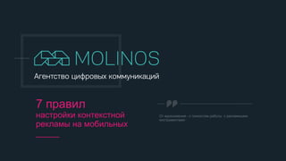 Документ описывает 7 правил настройки контекстной рекламы для мобильной аудитории, утверждая, что она обходит десктопную по числу пользователей. Основные рекомендации включают создание адаптивных сайтов, использование аналитики и правильный выбор ключевых слов. Важно также учитывать поведение целевой аудитории и использовать гиперлокальный таргетинг для повышения эффективности рекламы.