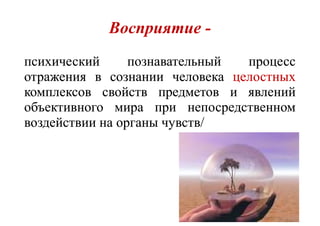 Документ описывает процесс восприятия как активный психический процесс, в котором участвуют ощущения, память и мышление. Рассматриваются свойства восприятия, такие как целостность, константность и избирательность, а также классификация восприятия на основе различных критериев. Упоминается влияние индивидуальных различий на восприятие и феномены иллюзий.