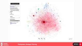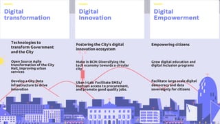 Barcelona is building a smart city through digital transformation and citizen participation. It is developing open data infrastructure, participatory platforms like Decidim, and sensor networks like Sentilo to power services, transparency and innovation. The city aims to foster equitable outcomes through initiatives like affordable housing and healthcare, sustainable mobility, and empowering citizens with digital education, democracy and data sovereignty tools.