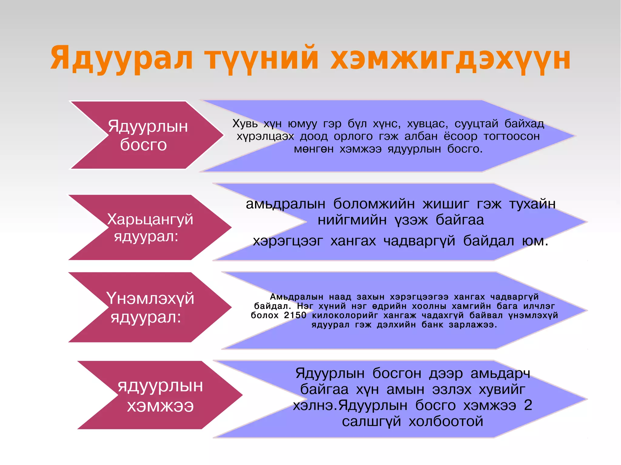 Яäóóðëûí Õóâü õ¿í þìóó ãýð á¿ë õ¿íñ, õóâöàñ, ñóóöòàé áàéõàä õ¿ðýëöaýõ äîîä îðëîãî ãýæ àëáàí ¸ñîîð òîãòîîñîí áîсãî ìºíãºí õýìæýý ÿäóóðëûí áîсãî. àìüäðàëûí áîëîìæèéí æèøèã ãýæ òóõàéí Õàðüöàíãóé íèéãìèéí ¿çýæ áàéãàà ÿäóóðàë: õýðýãöýýã õàíãàõ ÷àäâàðã¿é áàéäàë þì. ¯íýìëýõ¿é Àìüäðàëûí íààä çàõûí õýðýãöýýãýý õàíãàõ ÷àäâàðã¿é áàéäàë. Íýã õ¿íèé íýã ºäðèéí õîîëíû õàìãèéí áàãà èë÷ëýã ÿäóóðàë: áîëîõ 2150 êèëîêîëîðèéã õàíãàæ ÷àäàõã¿é áàéâàë ¿íýìëýõ¿é ÿäóóðàë ãýæ äýëõèéí áàíê çàðëàæýý. ßäóóðëûí áîñãîí äýýð àìüäàð÷ ÿäóóðëûí áàéãàà õ¿í àìûí ýçëýõ õóâèéã õýìæýý хэлнэ.ßäóóðëûí áîñãî хэмжээ 2 сàëøã¿é õîëáîîòîé
