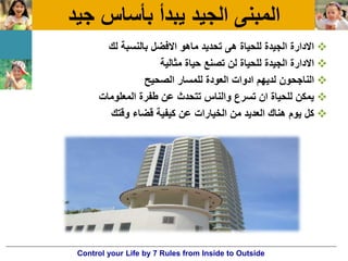 الوثيقة تقدم مجموعة من القوانين السبعة التي تهدف إلى السيطرة على الحياة من الداخل إلى الخارج، مع التركيز على أدوات الإدارة الذاتية. تشمل الأدوات المقترحة تقنيات مثل التخطيط، التفويض، وتنظيم الأهداف اليومية. يتحدث المستند عن أهمية الاستفادة من الوقت والموارد لتحقيق نتائج فعالة في الحياة.
