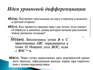 Документ рассматривает концепцию математического образования с акцентом на переход к ФГОС второго поколения и включает задачи по геометрии для ОГЭ и ЕГЭ. Основное внимание уделяется развитию логического мышления, практическому применению математики и навыкам самостоятельного решения задач. Также подчеркивается важность интерактивного обучения, межпредметных связей и формирования универсальных учебных действий.