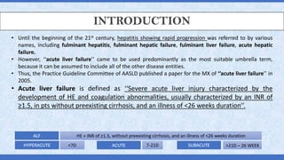 The document provides an overview of acute liver failure (ALF), including its definition, clinical assessment, causes, management strategies, and specific treatments for acetaminophen and mushroom poisoning. It outlines prognostic factors, the importance of intensive care unit treatment, and the critical role of N-acetylcysteine in acetaminophen overdose. Additionally, it discusses the phases of mushroom poisoning and treatment options for hepatic injury caused by Amanita species toxins.