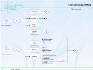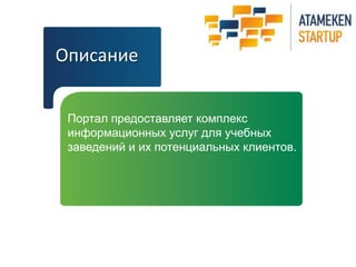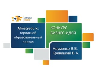 Документ описывает проект создания городского образовательного портала almatyedu.kz, который будет предоставлять информацию об учебных заведениях Алматинской области, включая дошкольные и высшие учебные заведения. Основной проблемой является поиск достоверной информации в разрозненной среде, а решение заключается в создании полного каталога и предоставлении услуг онлайн-обучения на трех языках. Бизнес-модель основана на получении дохода от платных услуг и рекламы, с прогнозируемой окупаемостью проекта в один год.
