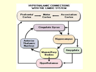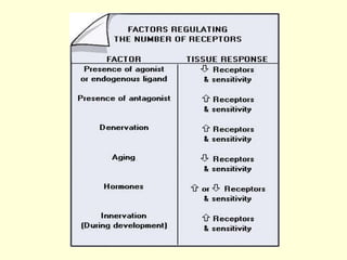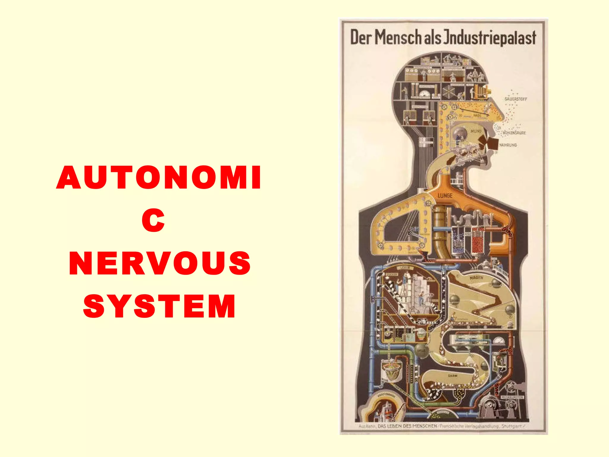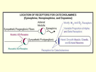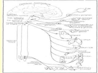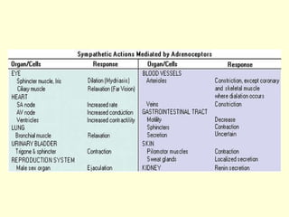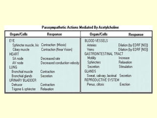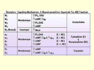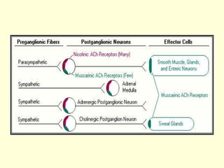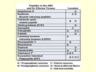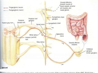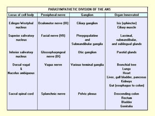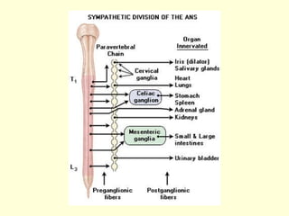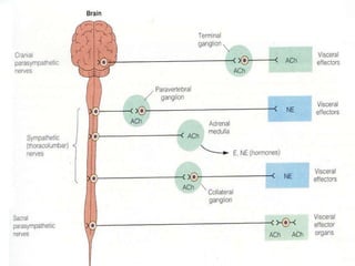 The autonomic nervous system regulates the body's internal environment and physical exchanges with the external environment, along with the endocrine system, to maintain homeostasis. It has two divisions - the sympathetic and parasympathetic systems. The central ANS is diffuse in the brain and spinal cord and controls the peripheral ANS neurons and organs. The peripheral ANS includes neurons that release neurotransmitters like acetylcholine and norepinephrine at targets like smooth muscle, cardiac muscle and glands to produce effects like increasing heart rate and relaxing bronchial muscles during the fight or flight response.