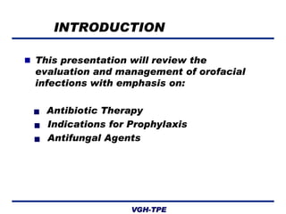This document discusses the evaluation, diagnosis, and treatment of orofacial infections with an emphasis on antibiotic therapy and prophylaxis. It outlines how to assess infections through medical history, exam, and identifying signs of infection. Most oral infections involve both aerobic and anaerobic bacteria. Commonly used antibiotics include penicillin, cephalosporins, metronidazole, and clindamycin. Antibiotics should be used as an adjunct to drainage and are indicated for severe infections, inadequate drainage, or compromised hosts. Prophylactic antibiotics are recommended for high-risk dental procedures in certain patients.