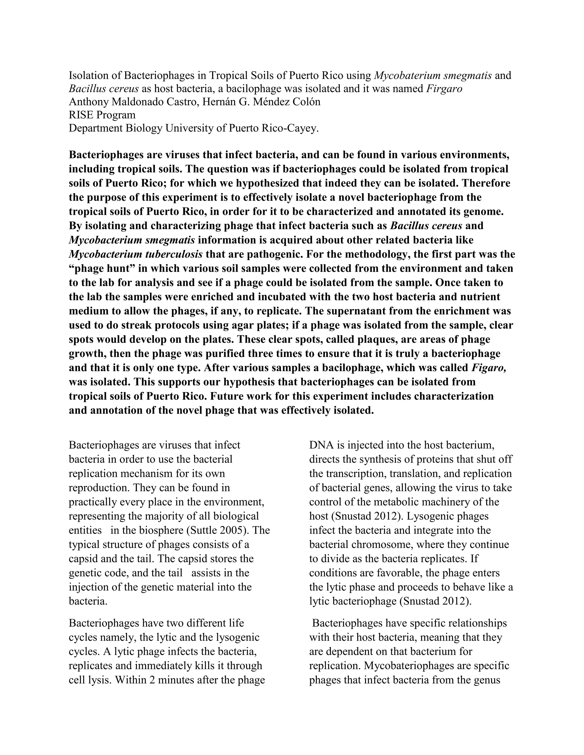 A bacteriophage was isolated from soil samples collected in Puerto Rico and named Figaro. Soil samples were enriched with Bacillus cereus and Mycobacterium smegmatis bacteria to allow any bacteriophages present to replicate. A "plaque" or clear spot indicating bacteriophage growth was detected on an agar plate streaked with one enriched soil sample. The isolated bacteriophage was purified through three rounds of plating and named Figaro. Characterization of Figaro's capsid proteins was conducted through staining. The successful isolation of a bacteriophage from Puerto Rican soil supports the hypothesis that bacteriophages can be found in tropical environments. Further characterization of Figaro's genome is warranted.