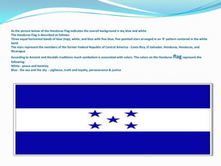 The Honduras flag features three equal horizontal bands of blue, white, and blue with five blue five-pointed stars arranged in an X pattern in the white band. The stars represent the five members of the former Federal Republic of Central America. The colors symbolize peace (white), the sea and sky (blue), and honesty, vigilance, truth, justice and perseverance.