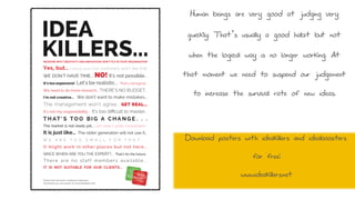 The document outlines seven creative brainstorming methods designed to generate a high volume of ideas quickly while fostering an open and collaborative environment. It emphasizes the importance of suspending judgment, maximizing quantity, and using various techniques such as brainwriting and reverse thinking to stimulate creativity among colleagues. Additionally, practical examples and challenges are provided to illustrate the application of these methods in a professional setting.