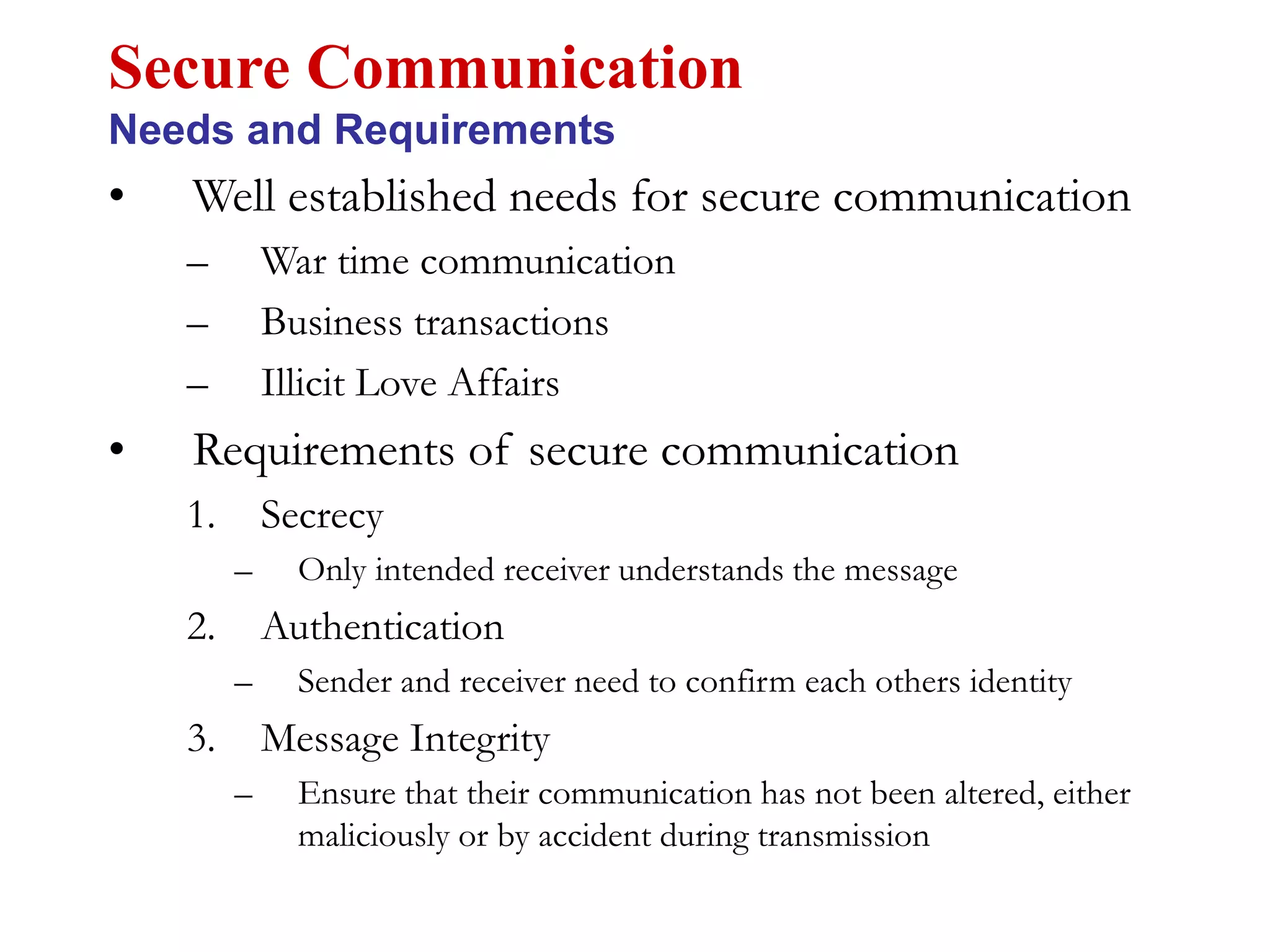 This document discusses computer security and cryptography. It covers the basics of cryptography including the needs for secure communication, symmetric and asymmetric encryption algorithms, cryptanalysis techniques, and authentication methods. Specific algorithms discussed include DES, Triple DES, RSA, Diffie-Hellman key exchange, and digital signatures. The document provides an overview of the key concepts and goals of cryptography.