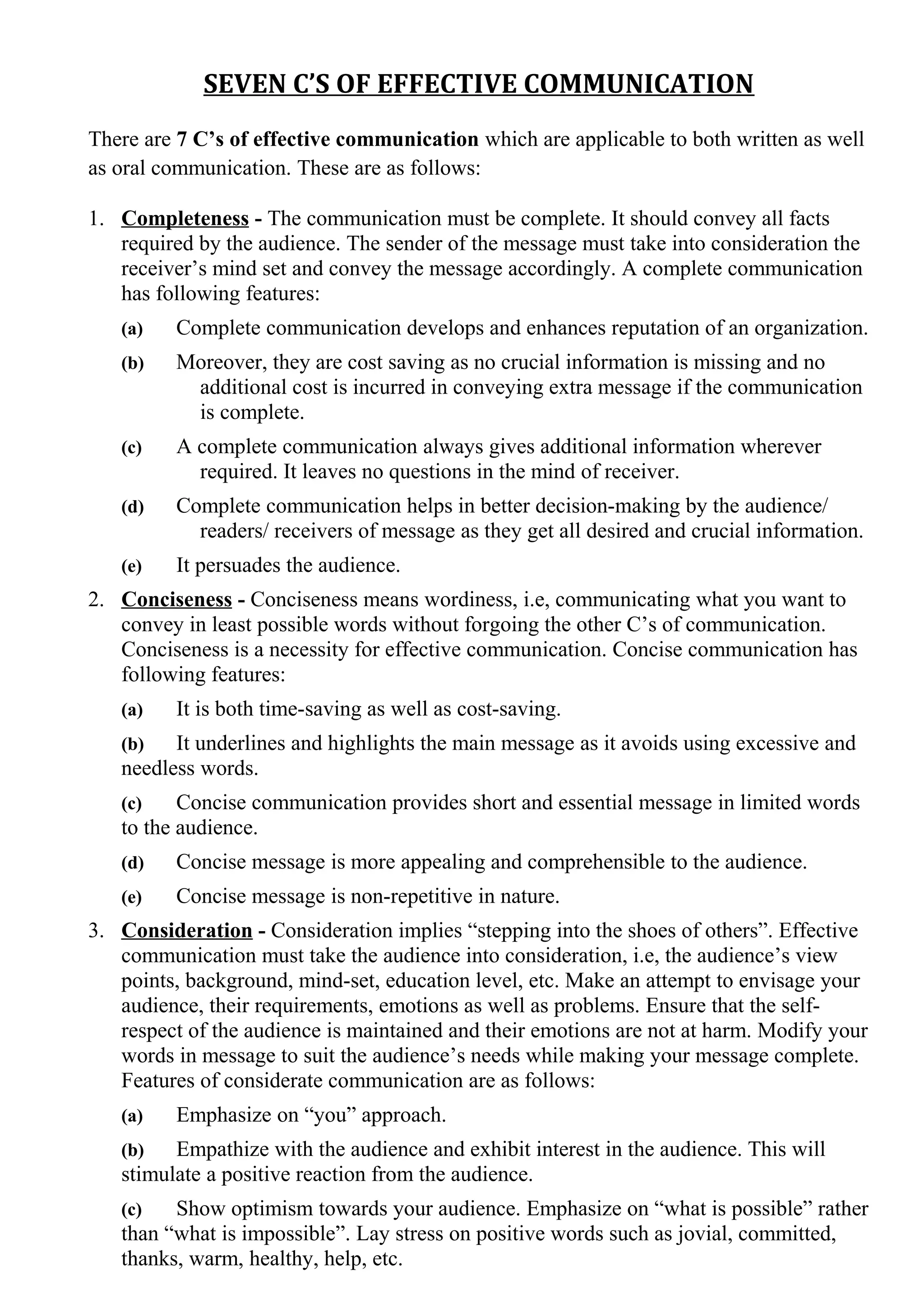 There are 7 C's of effective communication: completeness, conciseness, consideration, clarity, concreteness, courtesy, and correctness. Completeness means conveying all necessary information to the audience. Conciseness communicates the intended message using as few words as possible. Consideration involves understanding the audience's perspective and modifying the message for their needs. Clarity focuses on one specific message at a time for easier understanding. Concreteness supports the message with specific facts and details rather than general statements. Courtesy shows respect for the audience through a polite, unbiased tone. Correctness ensures no grammatical errors so the message has greater impact and boosts confidence. Mastering these 7 C's makes one an effective communicator