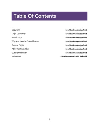 The document outlines a 7-day colon cleanse program as part of the Biofit Diet, emphasizing its importance for weight loss and overall health reset. It includes dietary guidelines and approved foods rich in fiber while advising on what to avoid during the cleanse. The plan starts with a colon detox involving sea salt and progressively introduces various fruit and vegetable-based meals throughout the week.