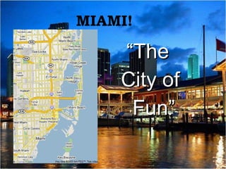 The document outlines a 7 day holiday to Miami, New York City, and Chicago. It provides details on hotels, restaurants, attractions and estimated costs in each city. The total budget for the trip is 5000 euros, and the document estimates that around 2178 euros will be spent, leaving enough money for the short trip. Key locations that will be visited include South Beach in Miami, Central Park and Empire State Building in New York, and Sears Tower in Chicago.