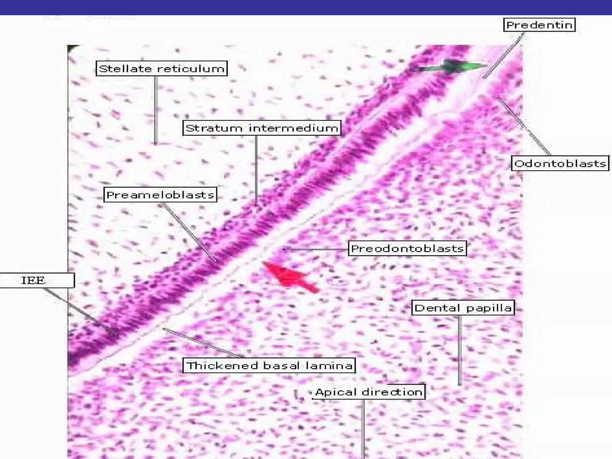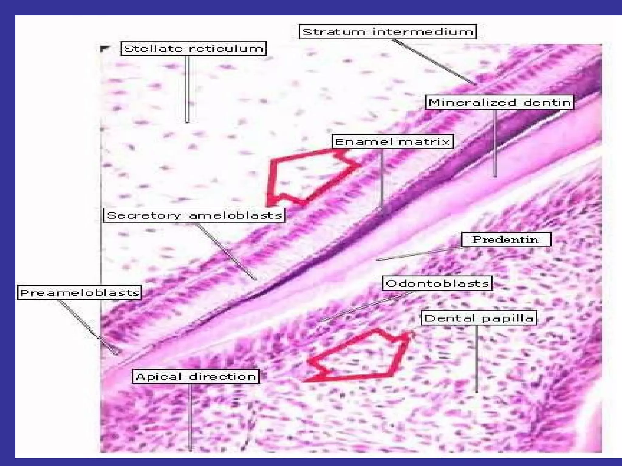 - Predentin - unmineralized matrix secreted by odontoblasts