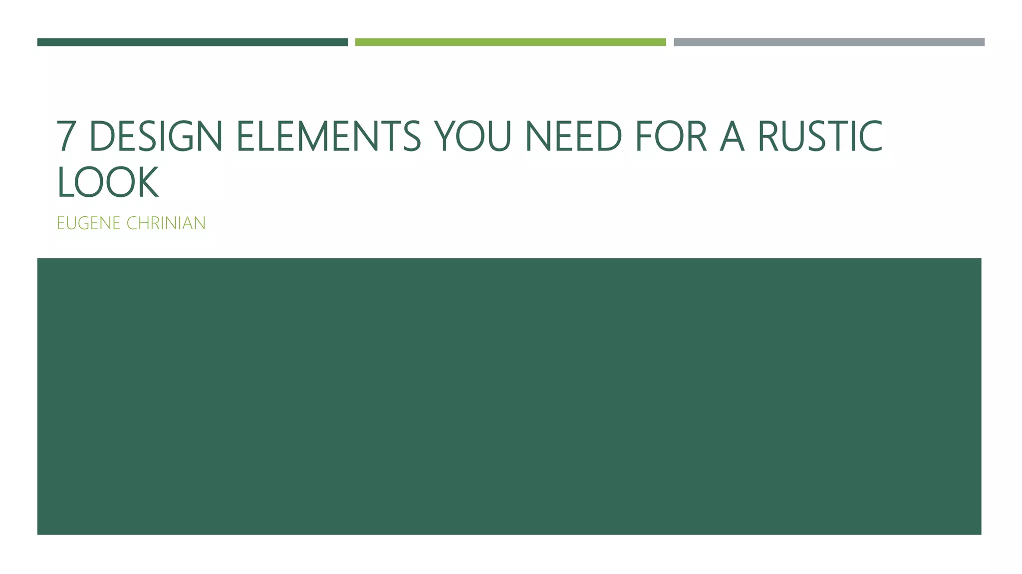 The document outlines seven essential design elements for achieving a rustic home aesthetic, focusing on the use of natural materials, warm neutral color schemes, and exposed wooden structures. Key aspects include incorporating reused objects, simple fabrics, and harmonizing modern influences with traditional rustic features. Overall, the rustic style combines comfort and simplicity while celebrating natural beauty.