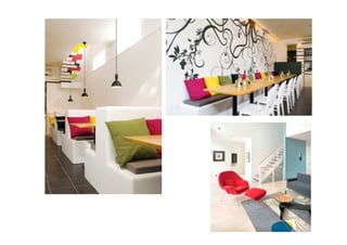 The document discusses the 7 principles of interior design: scale & proportion, unity & harmony, rhythm, balance, emphasis (focal point), colour, and detail. It provides descriptions and examples for each principle. Scale & proportion relate to the size of design elements relative to one another or the whole. Unity & harmony involve using common themes or styles to link different interior spaces. Rhythm incorporates repetition, progression, transition, and contrast of design elements to create visual movement. Balance can be symmetrical, asymmetrical, or radial based on the distribution of visual weight. The emphasis or focal point should draw attention. Color influences mood and atmosphere. Details are an important but often overlooked part of interior design.
