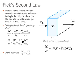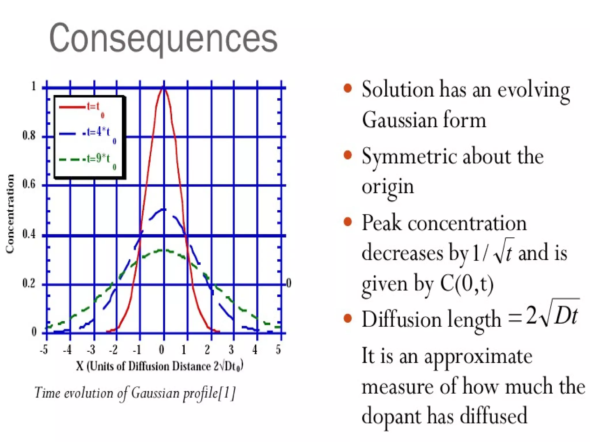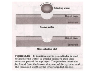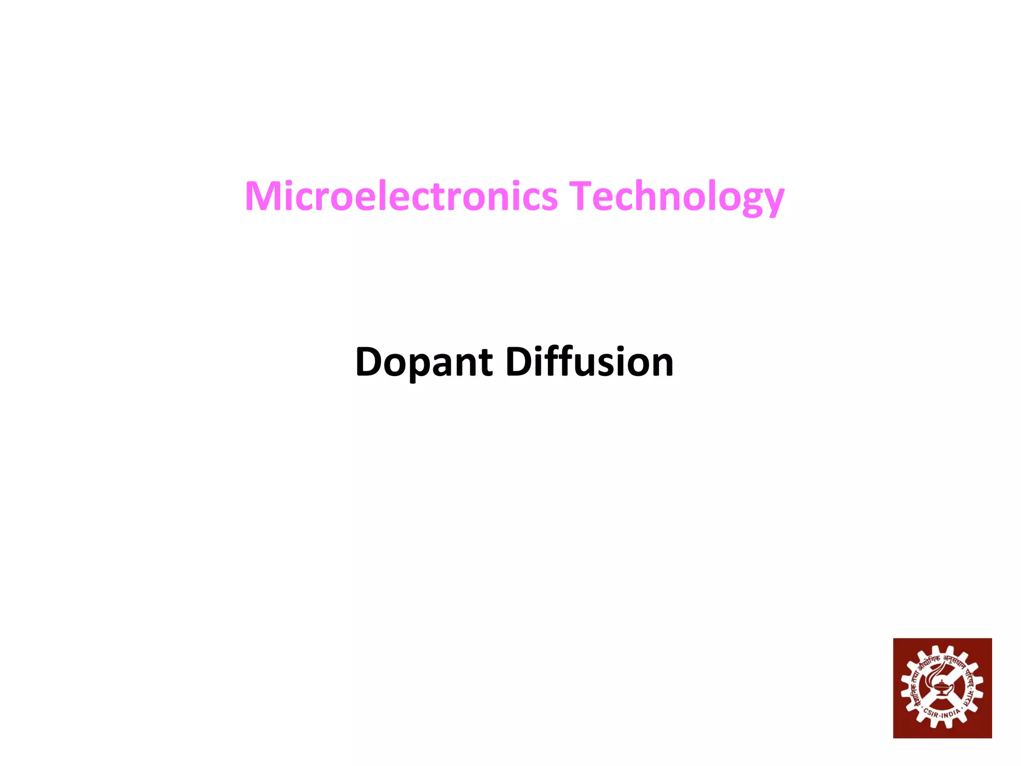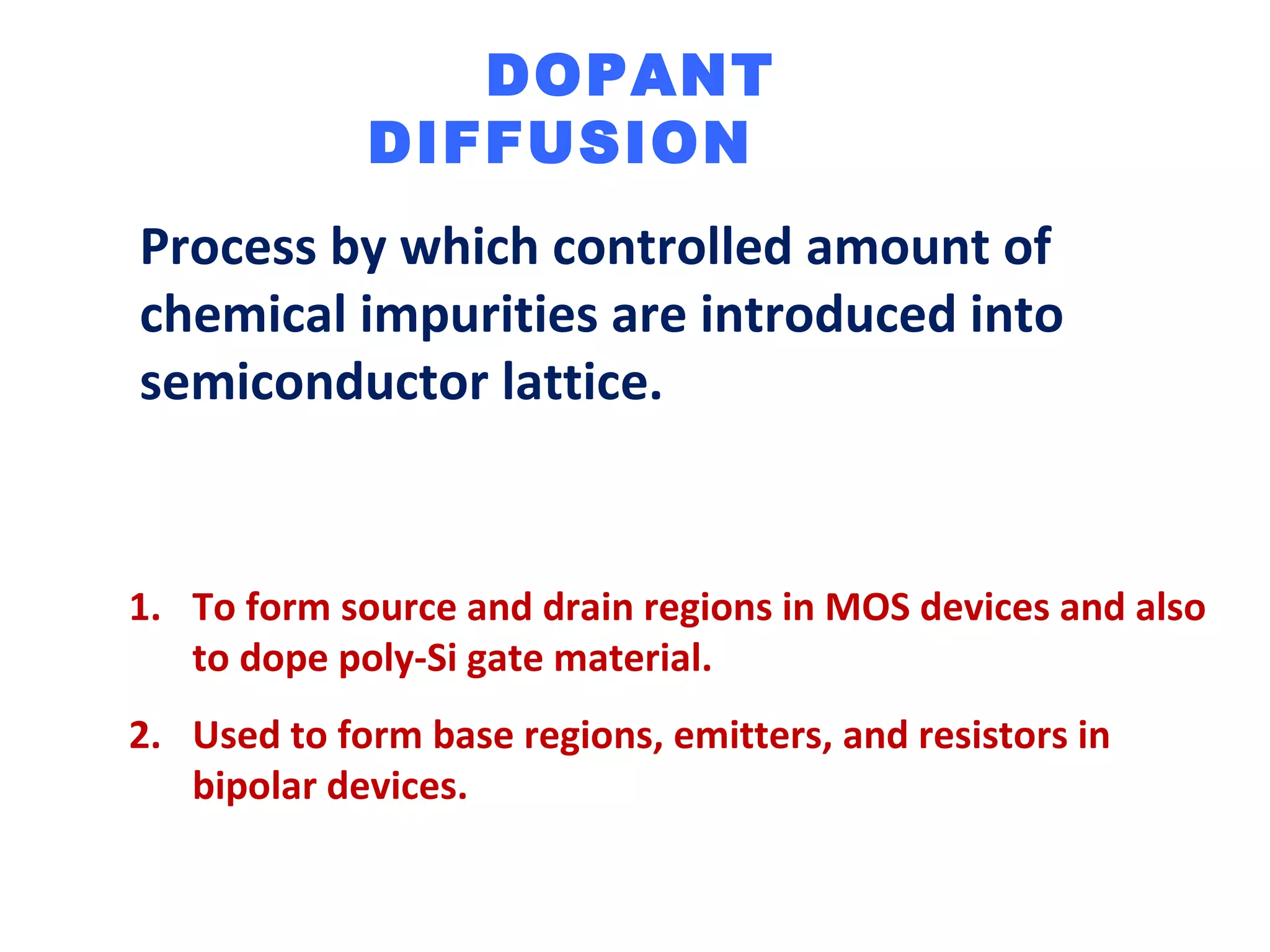 This document discusses dopant diffusion, which is the process of introducing controlled amounts of chemical impurities into a semiconductor lattice. Dopant diffusion is used to form source, drain, base, and emitter regions in semiconductor devices. The document covers various diffusion techniques and parameters, including diffusion sources, solid solubility limits, Fick's laws of diffusion, analytical solutions to the diffusion equations, design of diffused layers, and an example design calculation for a boron diffusion process.
