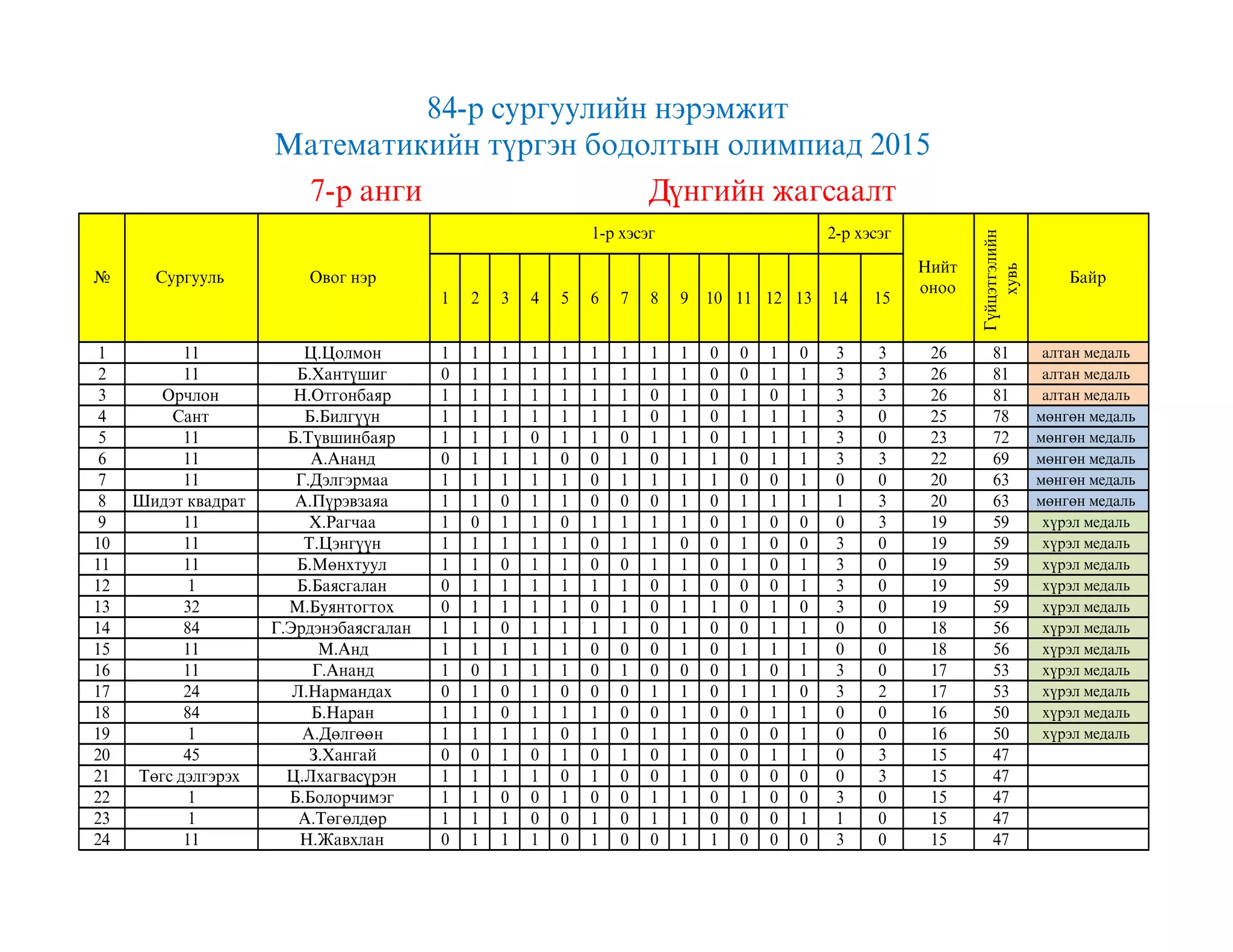 Документ содержит результаты олимпиады по математике для 7 класса 2015 года, где представлены участники, их показатели по различным заданиям и итоговые баллы. В таблице указаны имена участников, знакомство с их успехами в различных частях олимпиады и номера полученных медалей. Упоминается, что некоторые участники получили золотые, серебряные или бронзовые медали в зависимости от общих баллов.