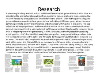 The document provides an evaluation of the author's research, planning, time management, technical qualities, aural qualities, aesthetic qualities, and audience appeal for their runner game project. Some strengths identified include researching other runner games to understand conventions, creating a detailed mind map and style sheet during planning, managing time effectively to complete all tasks, and implementing smooth character animations and loading bars. Some weaknesses discussed are a lack of detail in researching sound design and not including more background elements or animation in some areas. The author reflects on how they could improve certain aspects if doing the project again, such as adding more complex levels, background details, and dynamic music and sound effects.