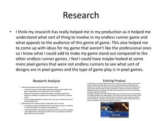 Jack Roberts evaluated his endless runner game project. He felt his research helped inform his game design but he could have researched more pixel games. While he planned his game well, some additional animation tests may have improved the final product. Better time management was needed as planning and research took longer than expected. Overall, the game's technical qualities were good but audio and aesthetics could be improved, such as adding more detailed backgrounds and enemy sounds. The sci-fi and gun themes along with the male protagonist were meant to appeal to a male audience.