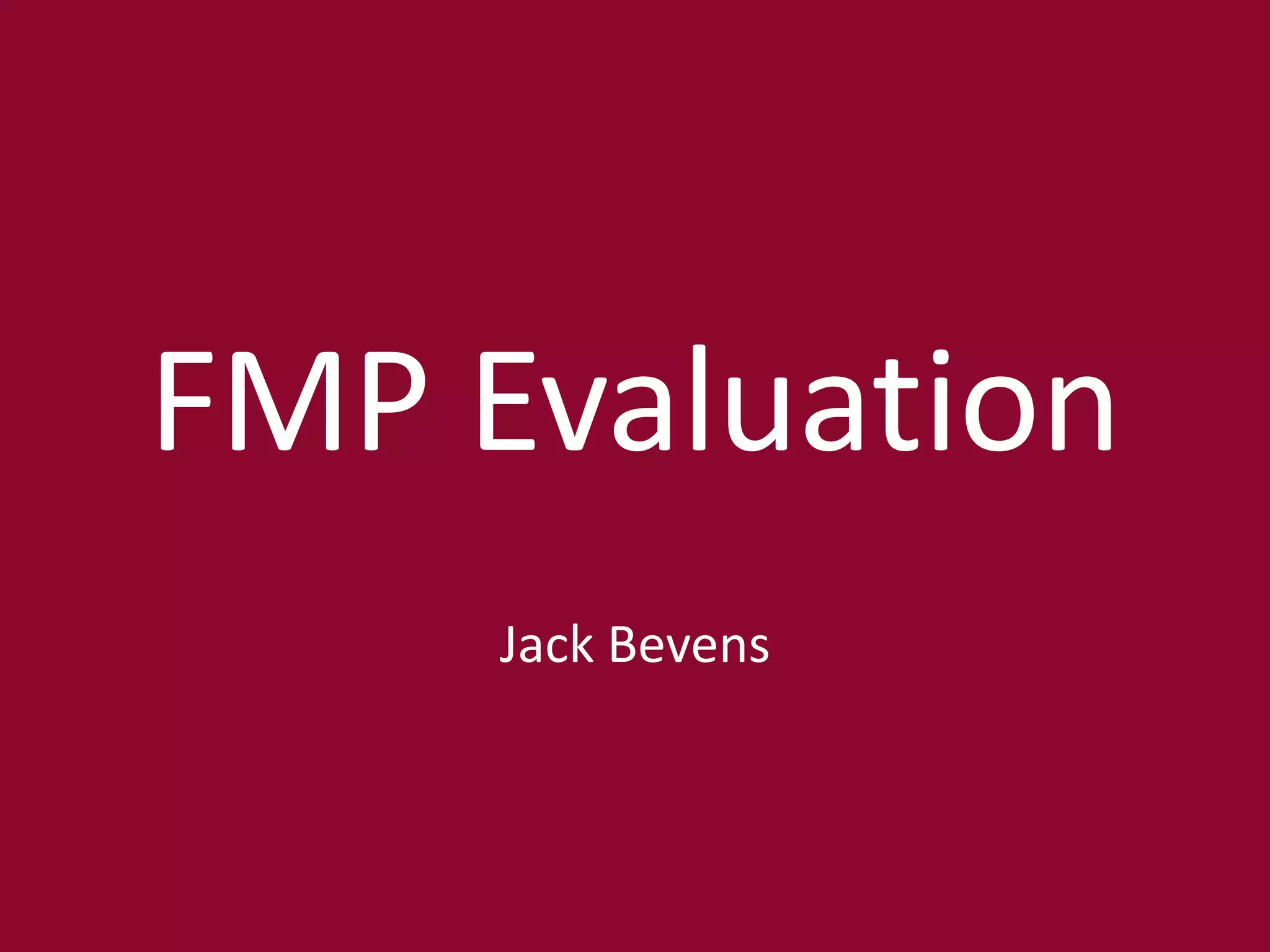This document outlines an evaluation of Jack Bevens' FMP project which includes sections on the production process, research, planning, time management, technical qualities, aesthetic qualities, audience appeal, and peer feedback. The peer feedback section contains feedback from 3 peers on what they liked about the project, improvements that could have been made, and a summary by Jack of what he agrees and disagrees with from the peer feedback.