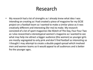 Oscar Gibb evaluated his magazine design project. His research involved studying sport magazines like Match of the Day and Four Four Two to help design a magazine that would appeal to both male and female audiences. For planning, Oscar drew on his experience creating a similar magazine project previously. His time management improved from past projects as he caught up after being ill. Oscar aimed to create a magazine with a more formal style than Match of the Day to appeal to older kids, combining elements of Match of the Day and Four Four Two. He used new Photoshop tools to improve the aesthetic qualities and felt it effectively targeted his intended teenage audience.