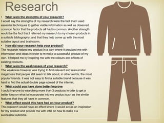 Amy Watson completed a print project evaluation for her college. In her research, she found common factors across different fashion magazine products and referenced them appropriately. Her research helped inspire her own product with colors and effects. However, finding popular magazines online proved difficult. For planning, she documented all her brainstorming ideas but could have planned more contingencies. Her time management was good but she could have added more to her article. Technically, her magazine had pastel colors and a unique title but she could have included more star quotes. Strengths included following her design plans, but writing the article was challenging. She believes her magazine appeals to audiences through its colors and context as promised.