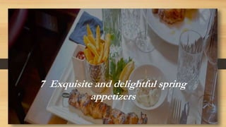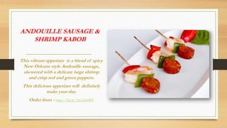 This document describes 7 exquisite spring appetizers including Andouille sausage and shrimp kabobs, beef empanadas, beef kabobs, beef Wellington, simmered meatballs, pork potstickers, and roasted lamb gyro. The appetizers incorporate ingredients like sausage, shrimp, beef, pork and lamb with vegetables and are available for ordering online from the listed web addresses. The appetizers aim to refresh and delight guests in the spring season with their vibrant and tasty combinations.