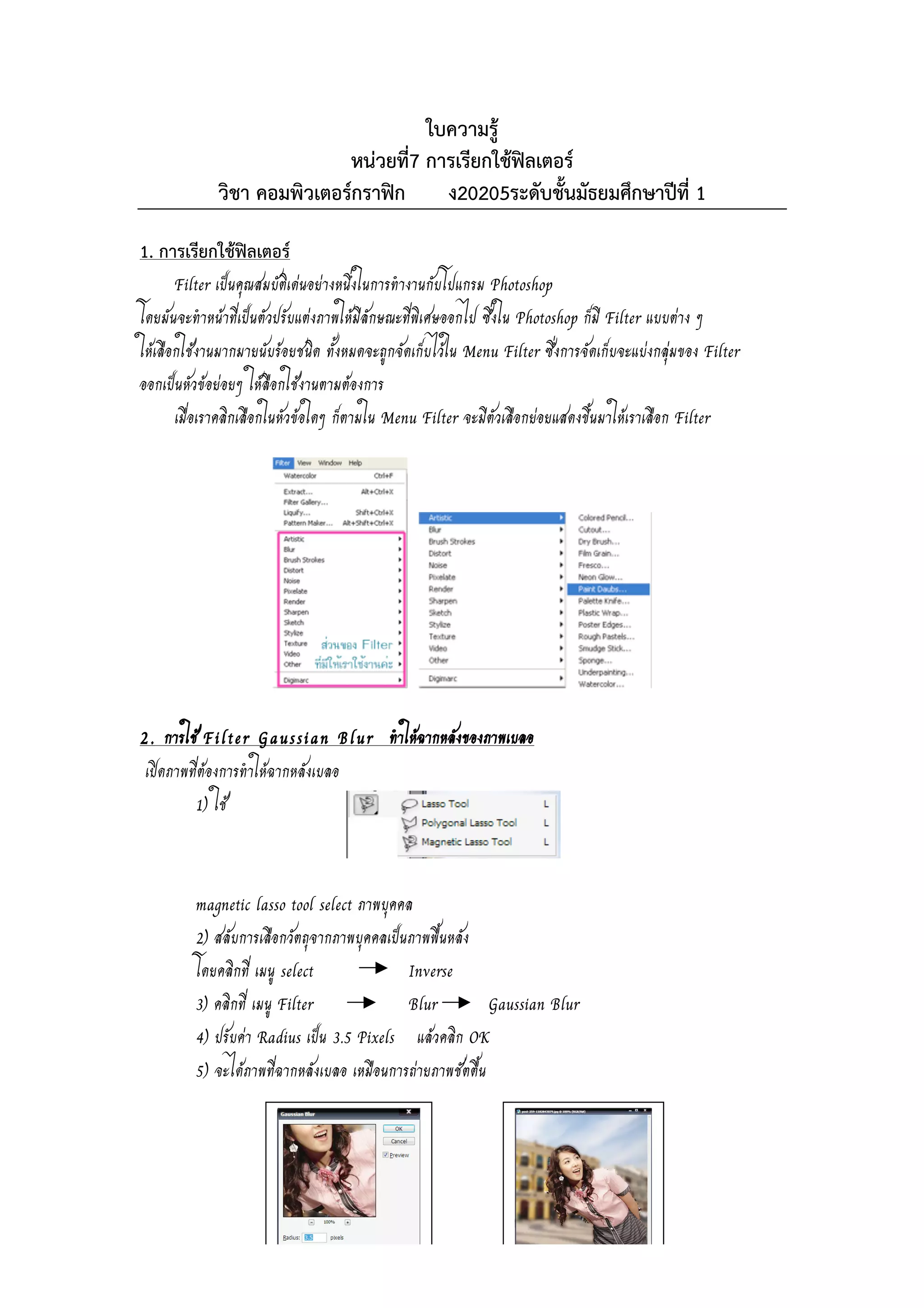 วิชา คอมพิวเตอร์กราฟิก ง20205ระดับชั้นมัธยมศึกษาปีที่ 1 1. การเรียกใช้ฟิลเตอร์ Filter เป็นคุณสมบัติเด่นอย่างหนึ่งในการทำงานกับโปแกรม Photoshop โดยมันจะทำหน้าที่เป็นตัวปรับแต่งภาพให้มีลักษณะที่พิเศษออกไป ซึ่งใน Photoshop ก็มี Filter แบบต่าง ๆ ให้เลือกใช้งานมากมายนับร้อยชนิด ทั้งหมดจะถูกจัดเก็บไว้ใน Menu Filter ซึ่งการจัดเก็บจะแบ่งกลุ่มของ Filter ออกเป็นหัวข้อย่อยๆ ให้ลือกใช้งานตามต้องการ เมื่อเราคลิกเลือกในหัวข้อใดๆ ก็ตามใน Menu Filter จะมีตัวเลือกย่อยแสดงขึ้นมาให้เราเลือก Filter 2. การใช้ Filter Gaussian Blur ทำให้ฉากหลังของภาพเบลอ เปิดภาพที่ต้องการทำให้ฉากหลังเบลอ 1) ใช้ magnetic lasso tool select ภาพบุคคล 2) สลับการเลือกวัตถุจากภาพบุคคลเป็นภาพพื้นหลัง โดยคลิกที่ เมนู select Inverse 3) คลิกที่ เมนู Filter Blur Gaussian Blur 4) ปรับค่า Radius เป็น 3.5 Pixels แล้วคลิก OK 5) จะได้ภาพที่ฉากหลังเบลอ เหมือนการถ่ายภาพชัตตื้น