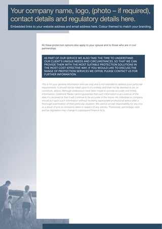 This document provides information about various types of financial protection options, including whole-of-life insurance, term life insurance, family income benefit, decreasing term insurance, critical illness insurance, income protection, and long-term care insurance. It explains what each option provides, such as a lump sum payment or replacement income. The document also states that the company can help clients understand their unique needs and circumstances to provide the most suitable and cost-effective protection solutions.