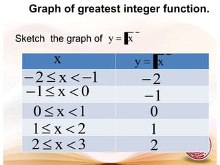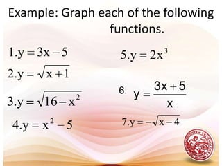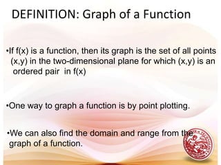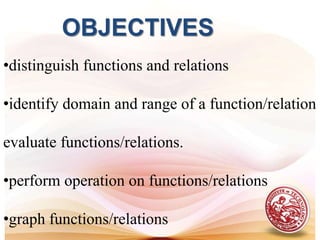 This document defines functions and relations. It discusses identifying the domain and range of functions and relations, evaluating functions, and performing operations on functions such as addition, subtraction, multiplication, division, and composition. It also covers graphing functions, including piecewise functions, absolute value functions, greatest and least integer functions. Key examples are provided to illustrate how to identify domains and ranges, evaluate functions, perform operations on functions, and graph different types of functions.