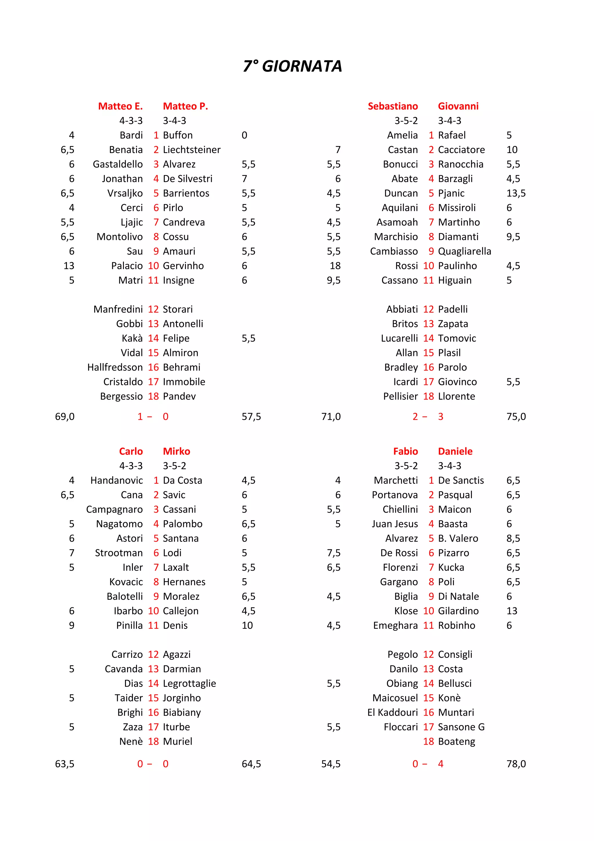 Il documento fornisce dettagli delle formazioni e delle prestazioni dei giocatori nella 7° giornata del campionato, evidenziando punteggi e schieramenti. Le formazioni presentano vari moduli, inclusi 4-3-3 e 3-5-2, e include valutazioni dei giocatori. I risultati delle partite indicano punteggi come 1-0 e 0-0.