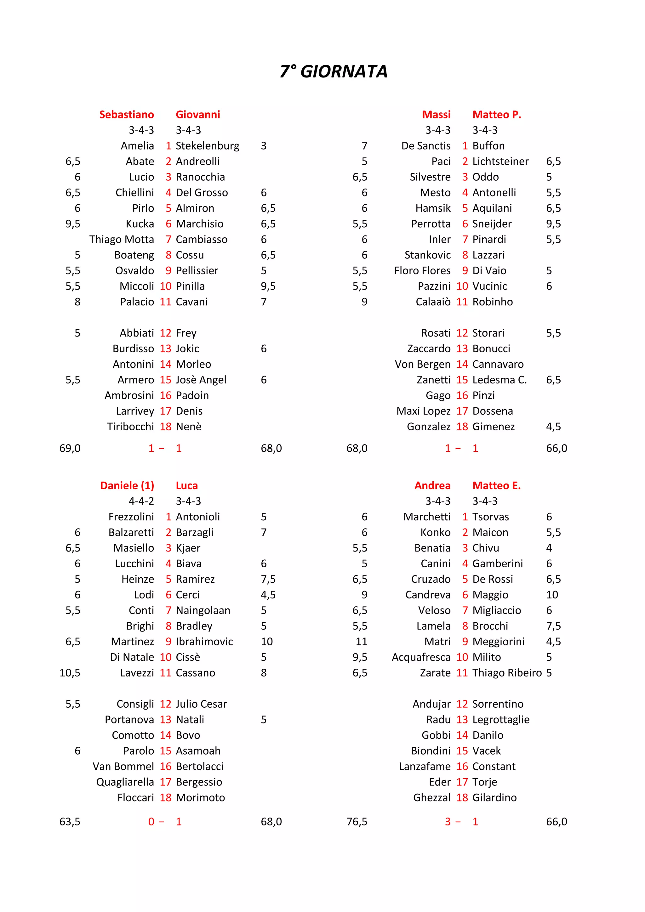 Il documento presenta le formazioni e le valutazioni dei giocatori per le partite della 7° giornata. Include punteggi assegnati a ciascun giocatore in base alle loro prestazioni. Inoltre, sono indicate le formazioni tattiche delle squadre coinvolte.