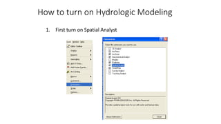 This document provides instructions for using ArcGIS tools to perform hydrologic modeling and watershed analysis on a digital elevation model of Bangladesh. It describes how to use the Spatial Analyst and Hydrology tools to: