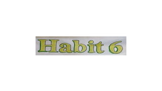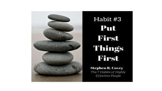This document summarizes key points from Stephen Covey's book "The 7th Habit". It discusses the 7 habits which are: 1) Be Proactive, 2) Begin with the End in Mind, 3) Put First Things First, 4) Think Win-Win, 5) Seek First to Understand, Then to Be Understood, 6) Synergize, and 7) Sharpen the Saw. For each habit, it provides definitions and explanations of important concepts like emotional bank accounts, win-win agreements, listening skills, and balancing the four dimensions of physical, mental, social, and spiritual renewal.