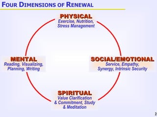 The document discusses Stephen Covey's Seven Habits of Highly Effective People. It describes the seven habits which are: 1) Be Proactive, 2) Begin with the End in Mind, 3) Put First Things First, 4) Think Win-Win, 5) Seek First to Understand, Then to Be Understood, 6) Synergize, and 7) Sharpen the Saw. It also outlines principles and paradigms that the habits are based on, such as continuous learning, balance, and self-renewal.
