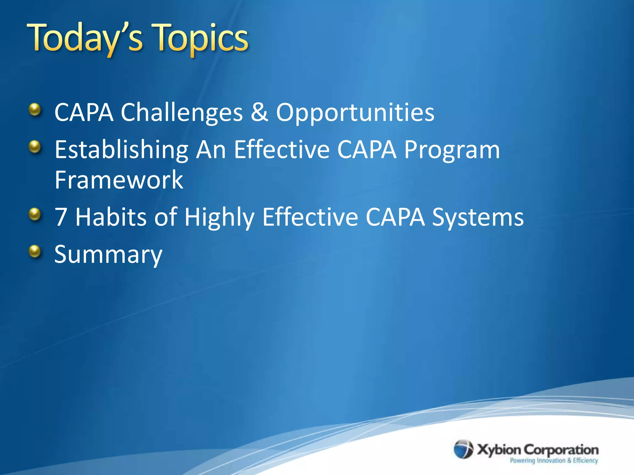 The document discusses best practices for establishing effective Corrective and Preventive Action (CAPA) programs, highlighting the importance of risk assessment and compliance with regulatory requirements from entities like the FDA and ISO. It outlines seven essential habits of effective CAPA systems, including problem identification, root cause analysis, and action plan implementation, while also addressing common causes of CAPA program failures and strategies for continuous improvement. Additionally, the document emphasizes the need for collaboration and proper documentation within an integrated system to enhance overall quality management.
