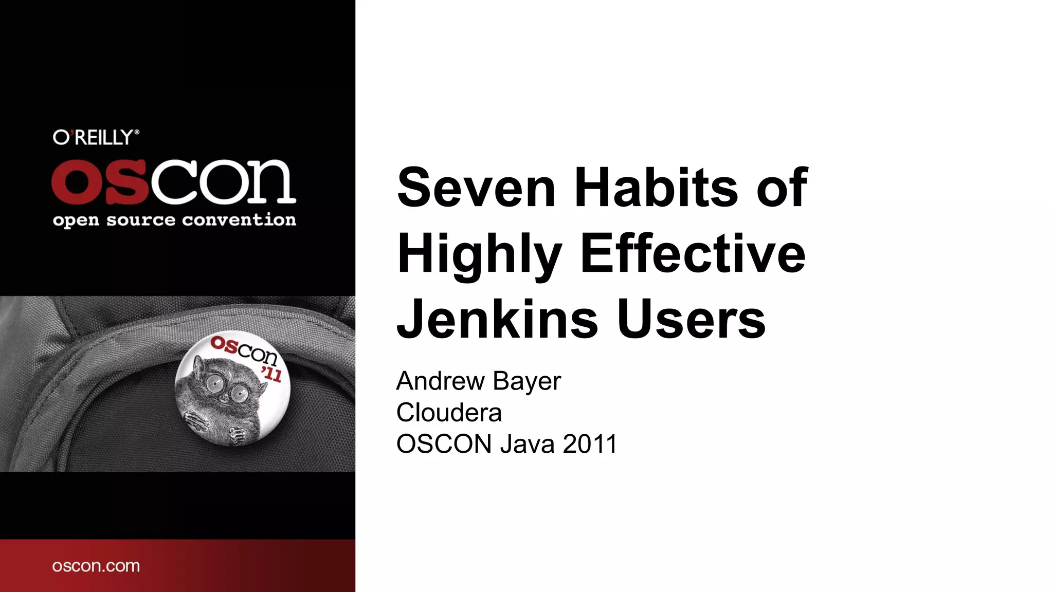 The document outlines seven habits of highly effective Jenkins users, emphasizing the importance of using plugins productively, standardizing build environments, and integrating with other tools. It also advises on managing builds efficiently by breaking up bloat, sticking with stable releases, and engaging with the Jenkins community. The author draws from personal experience and highlights that there is no single 'right way' to utilize Jenkins, encouraging adaptation to organizational needs.