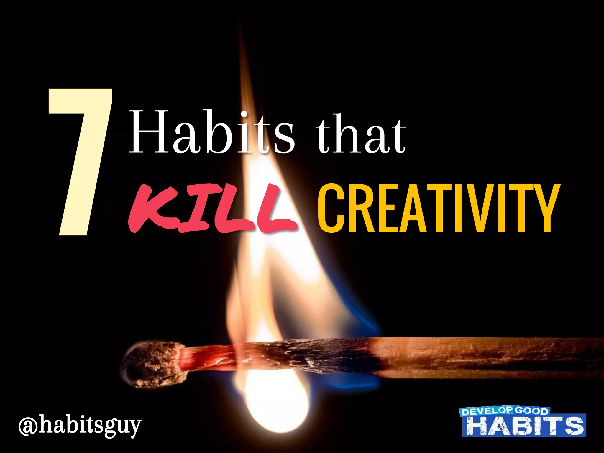 The document discusses 7 common habits that kill creativity: 1) Being too logical and rational, which stifles creativity, 2) Choosing the first solution rather than exploring alternatives, 3) Believing there is only one right answer rather than multiple approaches, 4) Lacking expert knowledge in a field rather than taking time to learn basics, 5) Having too much expert knowledge and limiting new experiences, 6) Being overwhelmed by data rather than focusing on enough information for creative thinking, and 7) Thinking one is not creative when creativity is a choice everyone can make in their daily lives. The author promotes a balanced lifestyle and self-improvement to support creativity.
