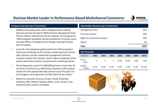 The document outlines the case study of zanox.de AG, a prominent player in performance-based multichannel commerce, detailing its history, shareholder structure, key financial metrics, and M&A milestones leading to its acquisition by Axel Springer AG and Publigroupe AG for EUR 215 million. It highlights the company's rapid growth, significant global presence, and innovative marketing solutions. Subsequently, zanox continued to expand its market leadership in performance advertising through organic and inorganic growth strategies post-acquisition.
