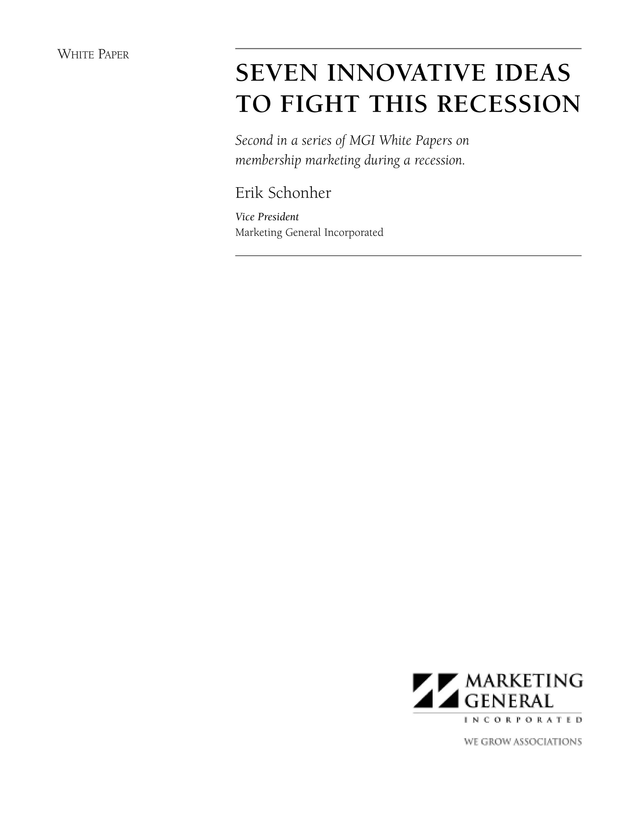 This white paper discusses 7 innovative ideas that associations can use to fight the current recession and maintain membership. These ideas include creating member "evangelists" to improve retention and acquire new members, personalizing the member experience, offering outrageous incentives like free hotel rooms to increase event attendance, leading by example on social issues, offering discounts for online payments or waiving fees, creating member relief programs, and using e-marketing for virtual events. The paper encourages associations to innovate and change programs that are not working today rather than waiting for economic conditions to change.