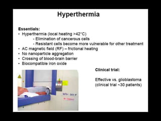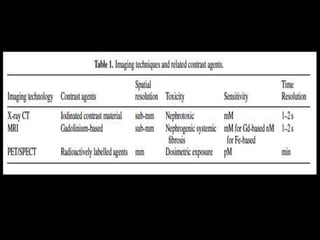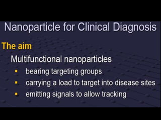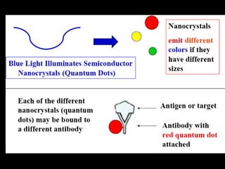 Quantum dots have unique spectral properties that make them useful fluorescent probes for cellular imaging. They can be made water-soluble and conjugated to biomolecules for targeting specific cells and structures. Quantum dots have advantages over traditional fluorescent probes like greater photostability and the ability to multiplex imaging. They have been used for in vitro and in vivo imaging applications like labeling cancer cells, visualizing capillaries and receptors, and observing subcellular structures in real-time. While useful imaging tools, quantum dots have limitations like potential toxicity that must be addressed for in vivo use.
