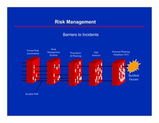 The document discusses Job Safety Analysis (JSA), which is a process to identify hazards and implement controls for each job step. It involves identifying hazards for each step, then developing safe work practices to eliminate or reduce potential incidents. JSAs should be done for high-risk tasks and whenever existing controls won't sufficiently manage risks. The key elements are separating the job into steps, identifying hazards for each step, then establishing controls. JSAs help ensure safety, gain commitment to safe practices, and identify more efficient work methods.